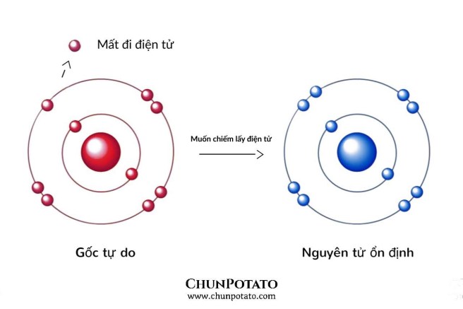 Vì rất nhiều nguyên nhân, mà nguyên tử ổn định/ phân tử có thể bị mất đi một Electron (điện tử) và trở thành một “Gốc tự do”. Có thể bạn không biết, gốc tự do còn là một “sản phẩm phụ” khi các tế bào của cơ thể chúng ta sử dụng oxy.