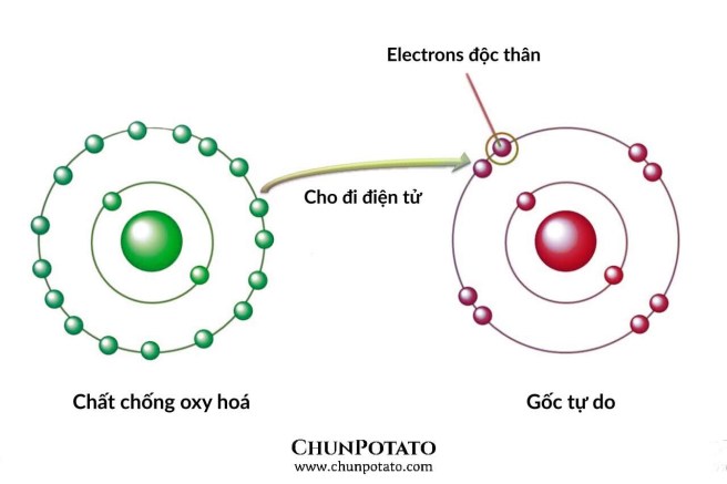 Chúng là các chất luôn sẵn sàng cho đi điện tử của mình để trung hoà gốc tự do mà “có thể” không tổn hại đến bản thân chúng. Tại sao Chun lại nói là có thể ? Bởi vì Sản phẩm của việc một chất Chống oxy hoá sau khi cho đi điện tử của mình vẫn có thể là một chất có hại. Và việc kết hợp nhiều Chất chống oxy hoá để xử lý sản phẩm phụ lẫn nhau giữa chúng mới là biện pháp tốt nhất để Chống oxy hoá toàn diện. Đó là lý chúng ta nên dùng những sản phẩm có công thức tốt và được sản xuất trong một công nghệ cao.