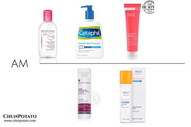 Routine rất ngắn gọn chỉ dưới 4 bước nhưng theo Chun là rất chặt chẽ. Đây là những sản phẩm mà bất cứ ai cũng nên dùng, tin mình đi, hãy vứt hết đống sản phẩm skincare lẩm cẩm đủ các bước toner serum bla bla mà chẳng hiểu công dụng là gì 😛
