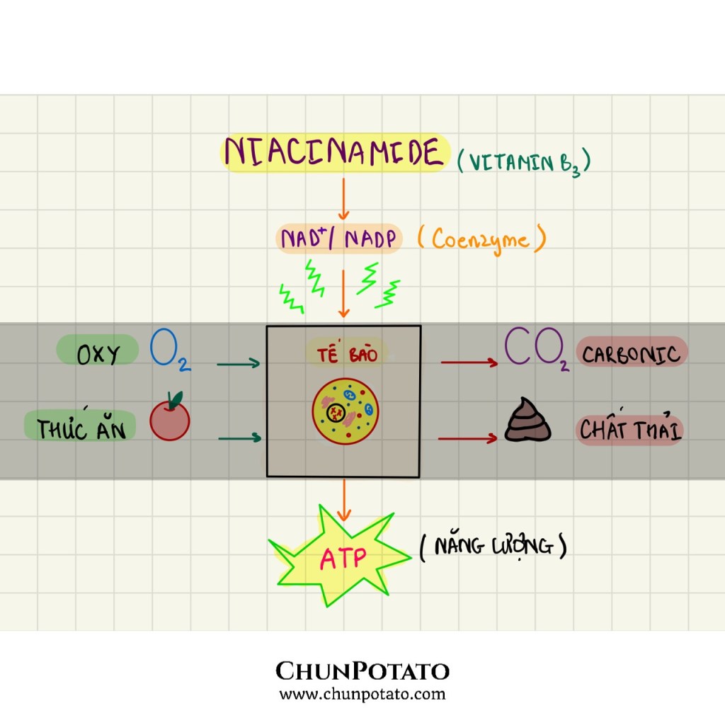 Niacinamide hay Nicotinamide/ Nicotinic Acid (Vitamin B3 hay Vitamin PP) cũng như các vitamin nhóm B khác tham gia vào quá trình chuyển hoá các chất dinh dưỡng thực phẩm: đạm, tinh bột, chất béo; vào trong cơ thể biến đổi thành 2 Coenzyme oxy hoá khử là NAD (Nicotinamide adenine dinuclotide) và NADP (Nicotinamide adenine dinuclotide phosphate): có chức năng tham gia vào chuỗi các phản ứng chuyển hoá, hô hấp tế bào, sản phẩm cuối cùng là ATP – năng lượng cho TB hoạt động.