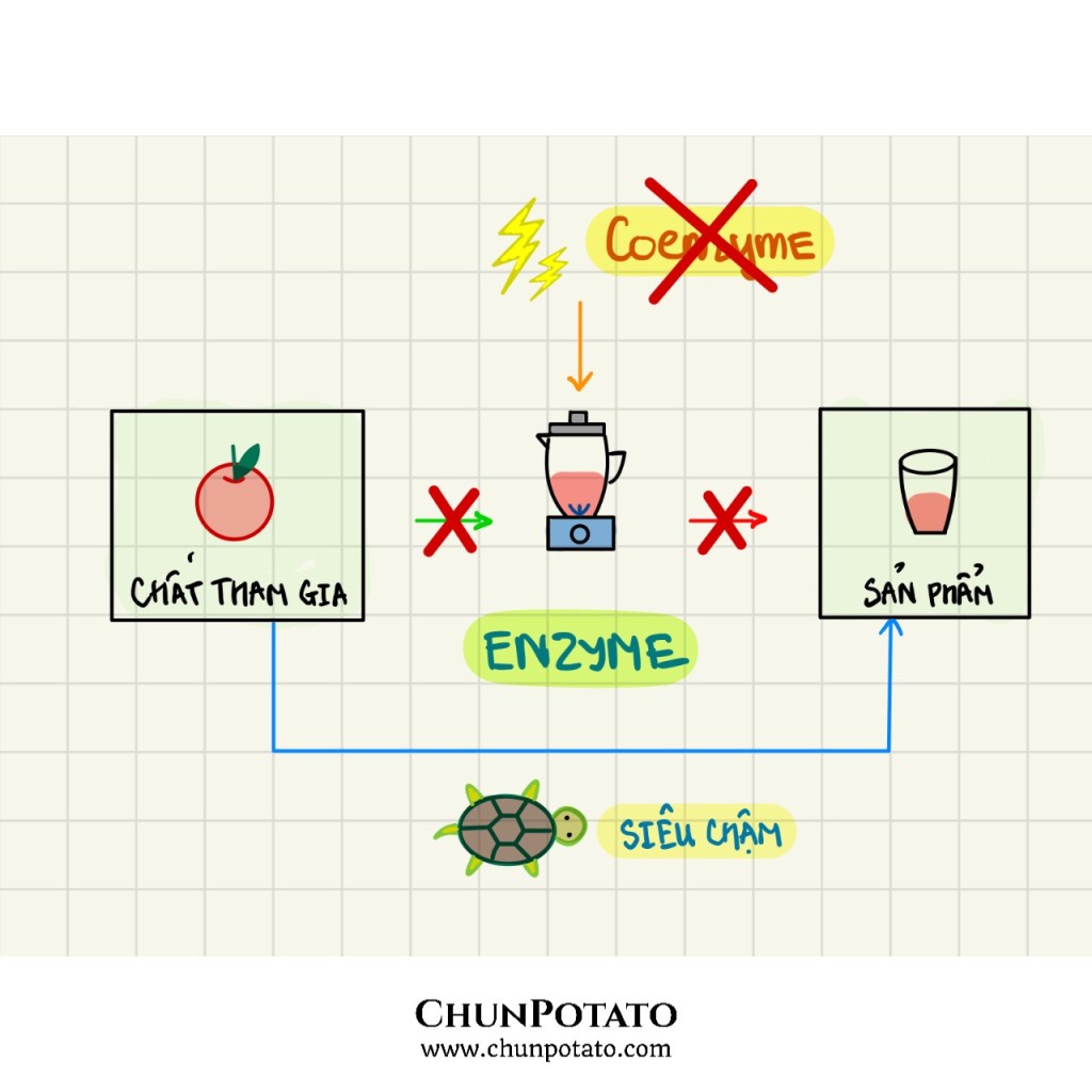 => Enzyme sẽ là máy xay và Coenzym sẽ là điện giúp máy xay hoạt động, giúp từ hoa quả -> tạo ra món sinh tố siêu nhanh.